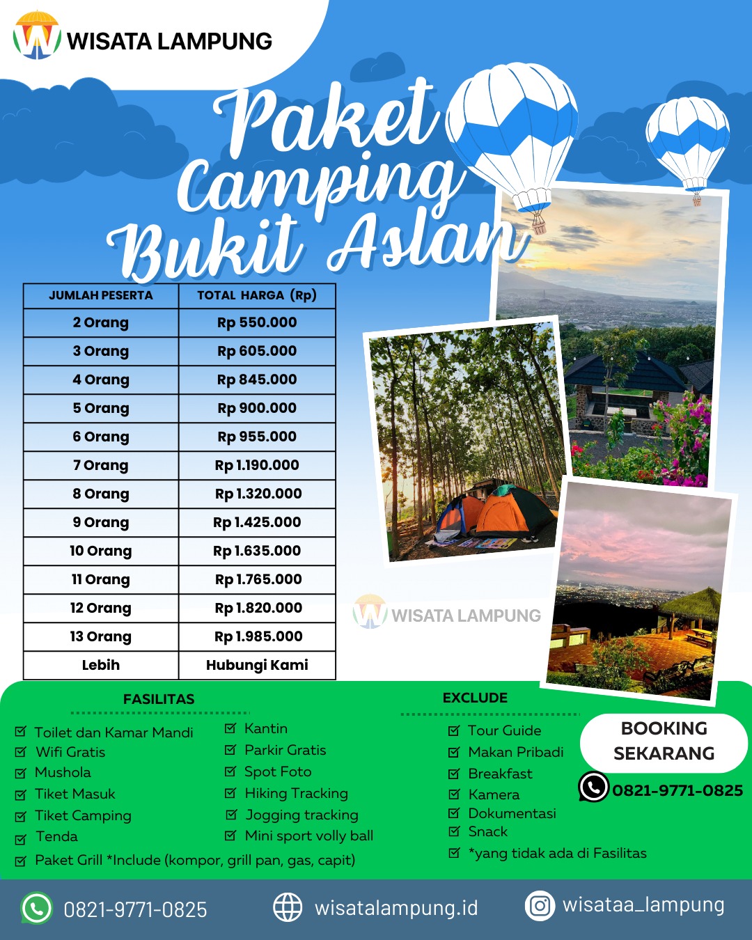 Paket Camping 2 Hari 1 Malam di Bukit Aslan, Bandar Lampung, menawarkan pengalaman petualangan yang mendebarkan di tengah alam yang masih alami dan indah. Dengan suasana yang tenang dan udara segar, paket ini memungkinkan para peserta untuk merasakan kedamaian alam.